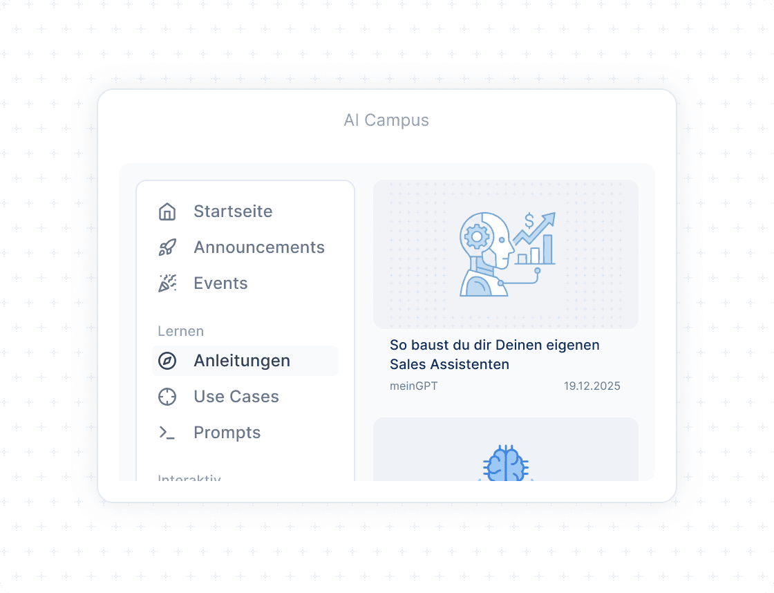 Profitiere von dem Wissen unserer KI Experten. Entdecke neue Use-Cases, Prompts, Workflows, Assistenten und nehme an interaktiven KI-Lernkursen teil.